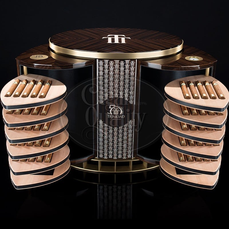 بيضاوي الشكل، يُفتح البابان الجانبيان ليكشفا عن صواني مفصلية يوضع عليها 5 سيجار في كل مرة. تبرز التطعيمات العديدة من عرق اللؤلؤ في خشب الأبنوس العمل الدقيق والراقي للحرفيين الذين صنعوا هذا المرطب.