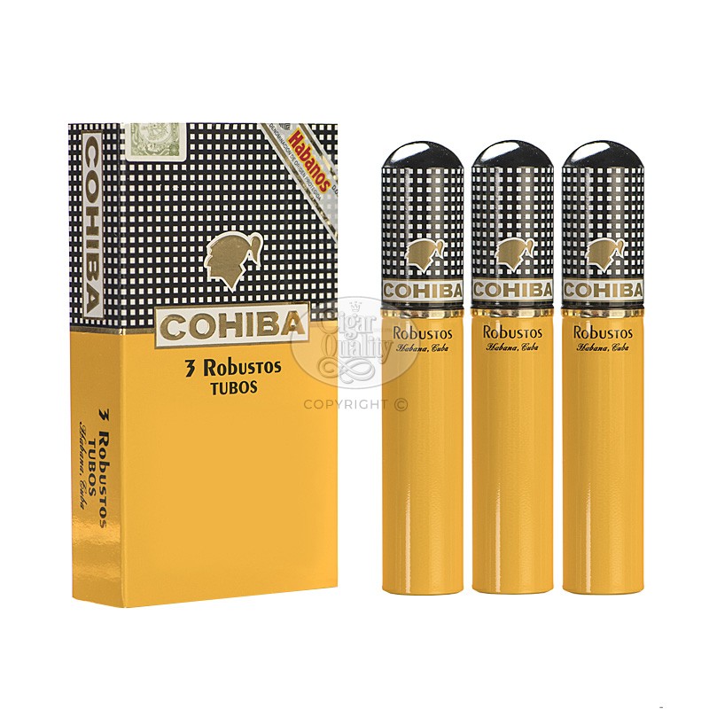 Le Cohiba Robustos Tubos (3), aux dimensions parfaites de 124 mm de longueur pour un diamètre de 19.84 mm, reste la référence pour beaucoup d’aficionados et est présent dans la plupart des gammes de cigares Cubains et non Cubains.
