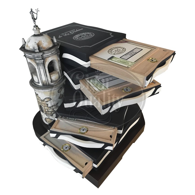 Selon la légende, le sculpteur Geronimo Martinez Pinzon a créé la statue de La Giraldilla à l’image de Dona Ines de Bobadilla. Dona Ines montait tous les jours à la tour de guet, regardant l’horizon en attendant que son mari revienne de ses voyages. Les tiroirs ont ici une double signification, d’abord comme 5 marches, chacune représentant un siècle de La Habana et en même temps représentant la mer. Les inserts blancs des tiroirs représentent l’écume de mer et les frontaux sont des poignées permettant d’ouvrir les tiroirs et d’accéder aux caisses de La Gloria Cubana Orgullosos.