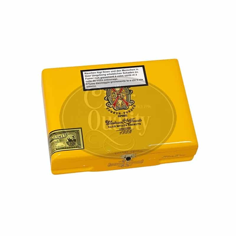 La boîte jaune-orangée, signature du Arturo Fuente Fuente Opus X Oro Oscuro Fuente Fuente, promet la découverte d’un trésor à la hauteur des attentes des adeptes de la marque. A l’intérieur de cet écrin exquis, vous découvrirez un Corona parfaitement confectionné, arborant la magnifique cape dominicaine du Opus X qui fut soumise à un processus de fermentation prolongé dont la recette hautement secrète reste à découvrir. C’est ce procédé qui permet à la cape de développer son coloris unique; un Maduro noir et chocolaté. Les arômes du cigare sont ainsi redéfinis dans leur puissance et leur intensité.