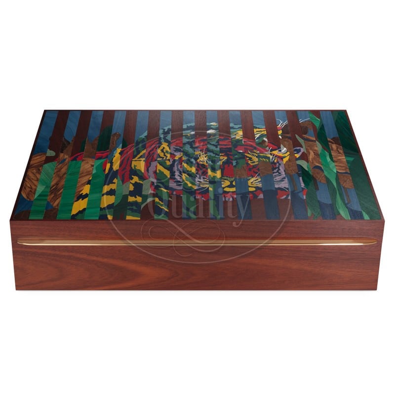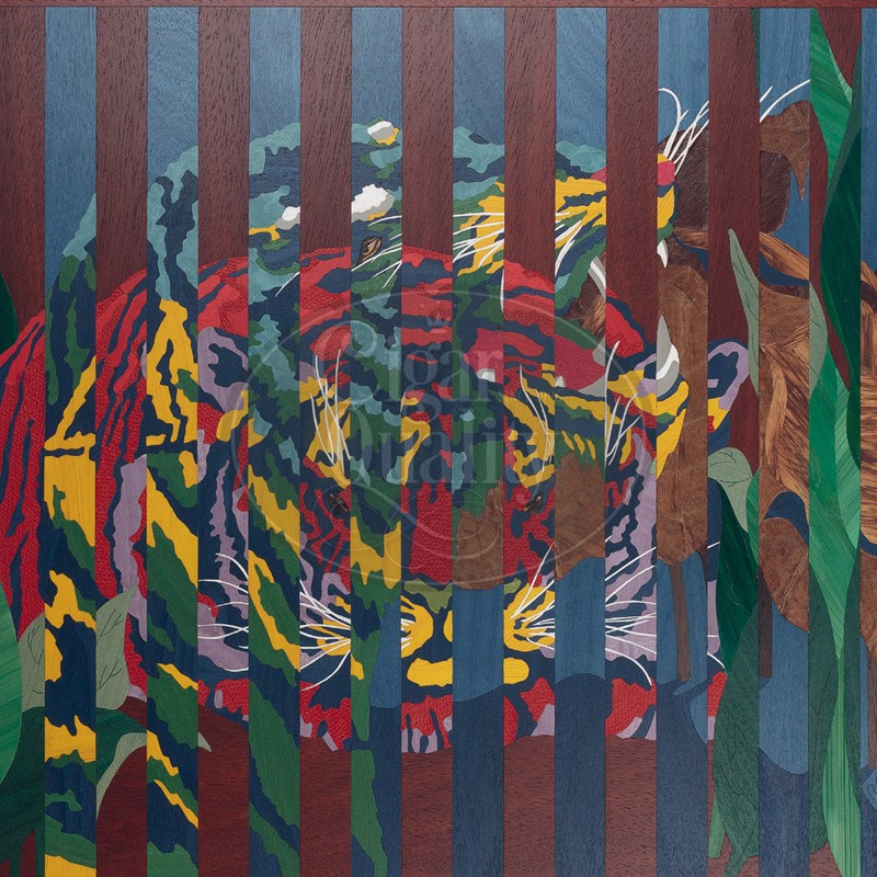 Le majestueux Davidoff Masterpiece Humidor Year of the Tiger a été conçu par l’artiste chinois Qi Xie et décoré à la main par Rose Saneuil en France. A travers une marqueterie remarquable et minutieuse de près de 1’000 pièces, Rose Saneuil a donné vie aux deux magnifiques tigres de Qi Xie sur la cave. Couleurs exceptionnelles, formes qui se chevauchent et s’entrelacent – l’humidor est un véritable chef-d’œuvre de l’artisanat.