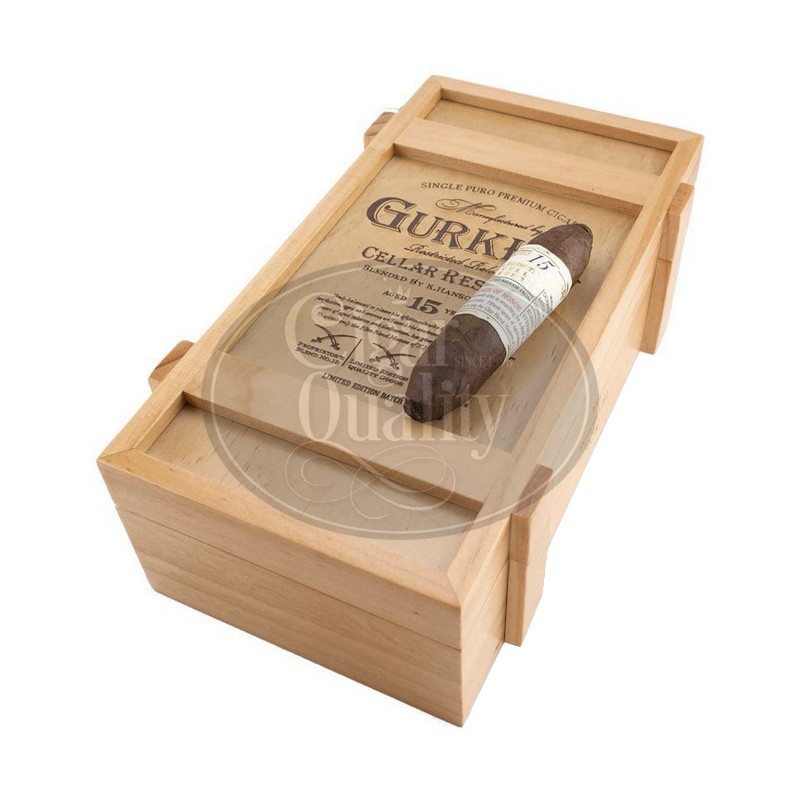 La Cellar Reserve 15 Years de Gurkha, utilise les meilleurs tabacs matures de qualité supérieure de 15 ans de la République dominicaine, maintenus ensemble par une sous-cape Olor et finis par une cape Criollo 1998. Étant donné que la maturation de ce cigare joue un rôle important, les boîtes ressemblent à l’origine à une boîte à vin, ce qui donne aux Gurkhas un look tout à fait particulier. Cet amour du détail est également évident dans chaque cigare, tous portant une queue de cochon en forme de spirale comme ornement sur le bonnet.