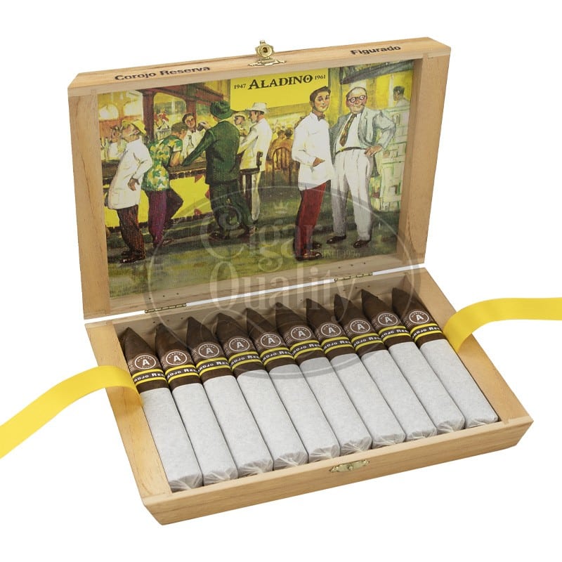 Les Aladino Corojo Reserva Figurado sont vendus en boîte de 10 cigares et existent aussi au format Robusto (N°4).