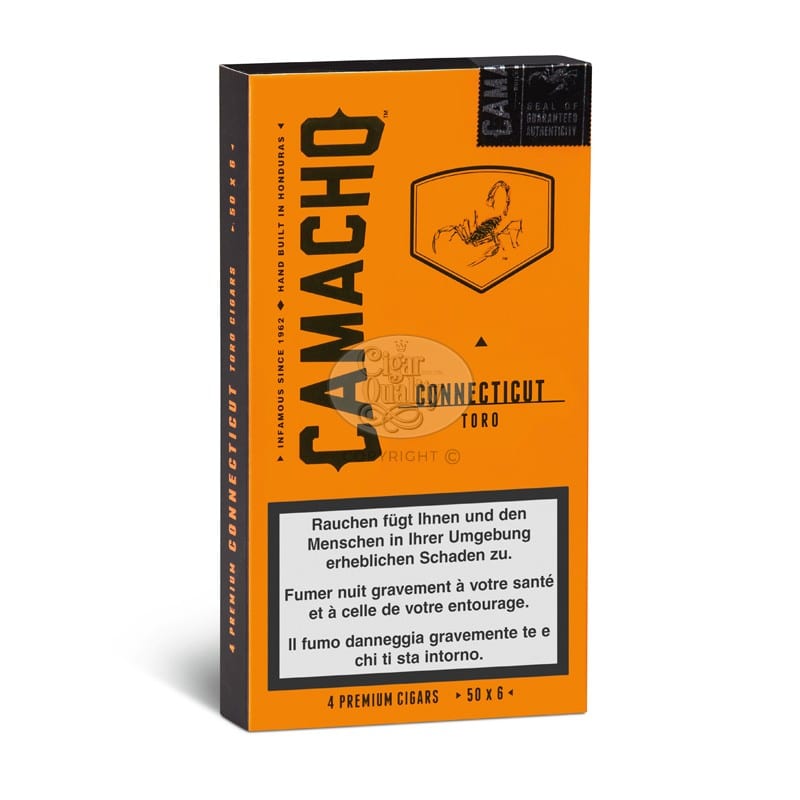 Le Camacho Connecticut Toro aux allures de long Robusto est recouvert d’une cape claro. Comme le reste de la gamme Connecticut, le tabac de sa tripe trouve ses origines au Honduras et à Saint-Saint-Domingue. La sous-cape provient du Honduras, quant à la cape Connecticut, elle est originaire d’Equateur. Cette vitole est relativement légère à cru, le fumage rappelle les notes aromatiques de la gamme Camacho mais conserve une relative douceur en bouche.