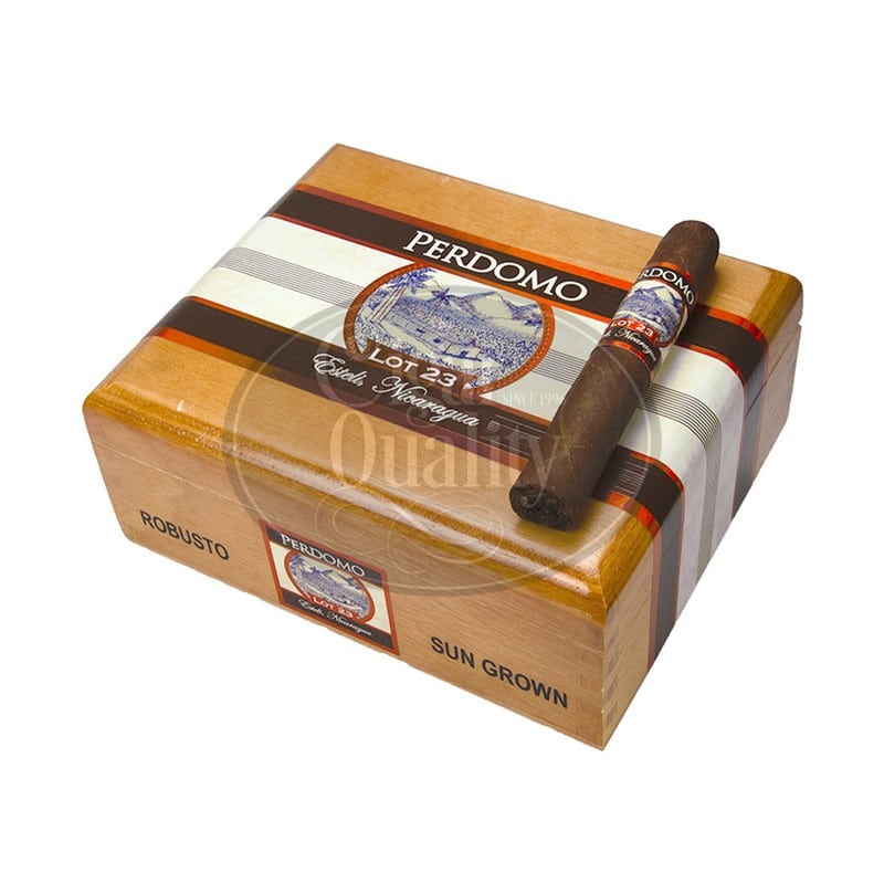 La gamme Perdomo Lot 23 fait référence à une parcelle de terre vierge découverte par Nick Perdomo et son père au Nicaragua, où ils ont décidé de planter une récolte de tabac Criollo et Corojo ’98 l’année 2000. Le Perdomo Lot 23 Sun Grown Robusto est doté d’une magnifique enveloppe Sun Grown de 5 ans d’âge, à base de graines cubaines du Nicaragua, qui ajoute un piquant doux aux robustes tabacs de la sous-cape et de la tripe cubaines du Nicaragua. Le Perdomo Lot 23 Sun Grown Robusto offre une saveur de noix avec des notes de cèdre et d’épices en fin de bouche.