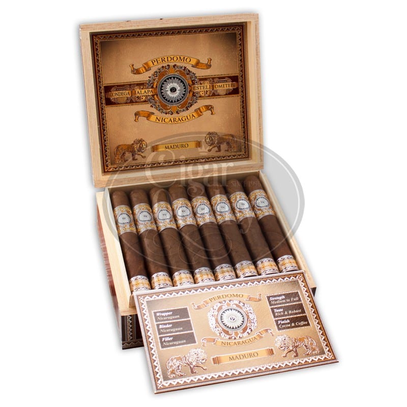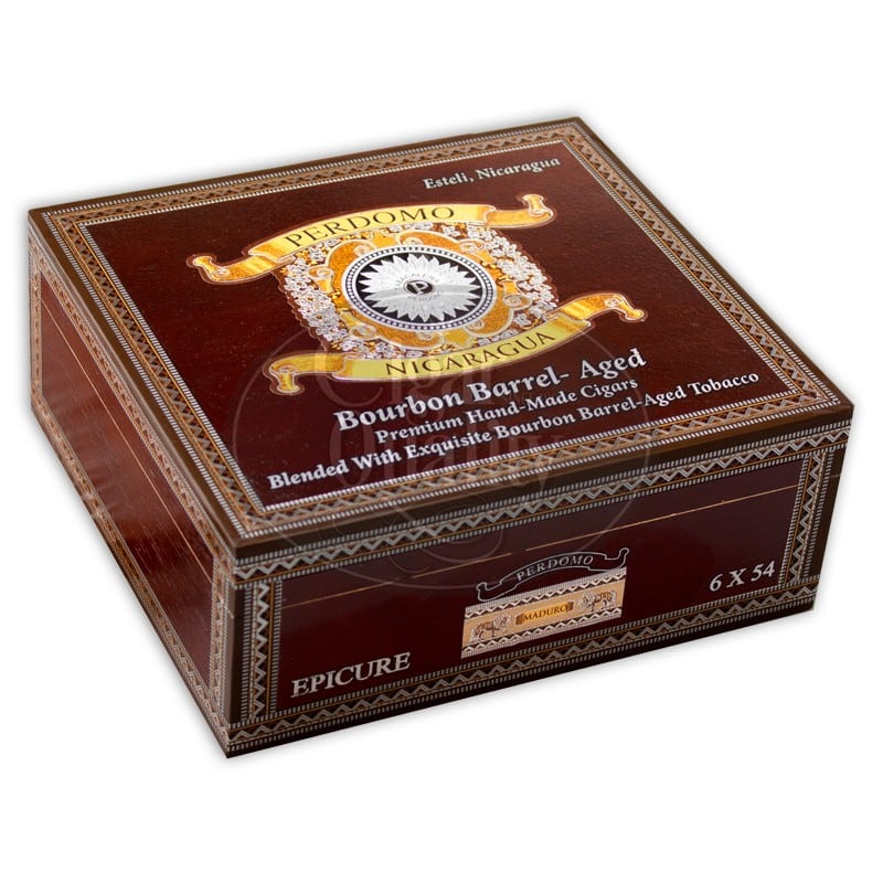 Le Perdomo Nicaragua Bourbon Barrel Aged Maduro Epicure est livré dans une boîte en bois magnifiquement conçue avec 24 pièces.