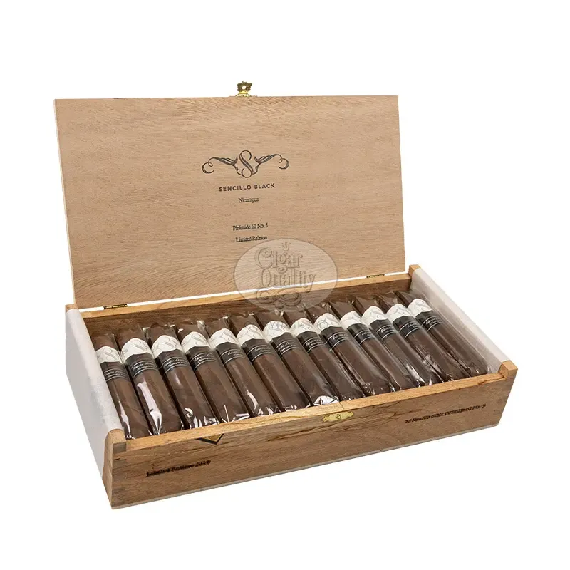Sencillo Black est une interprétation affirmée de la marque Sencillo. Le Sencillo Black Piramide 60 No. 5 est conçu pour une dégustation quotidienne tout en conservant une identité marquée. Entièrement roulé à la main, il est composé d’une cape Habano nicaraguayenne, d’une sous-cape du Nicaragua et d’une tripe issue du Nicaragua, du Honduras et du Mexique.
