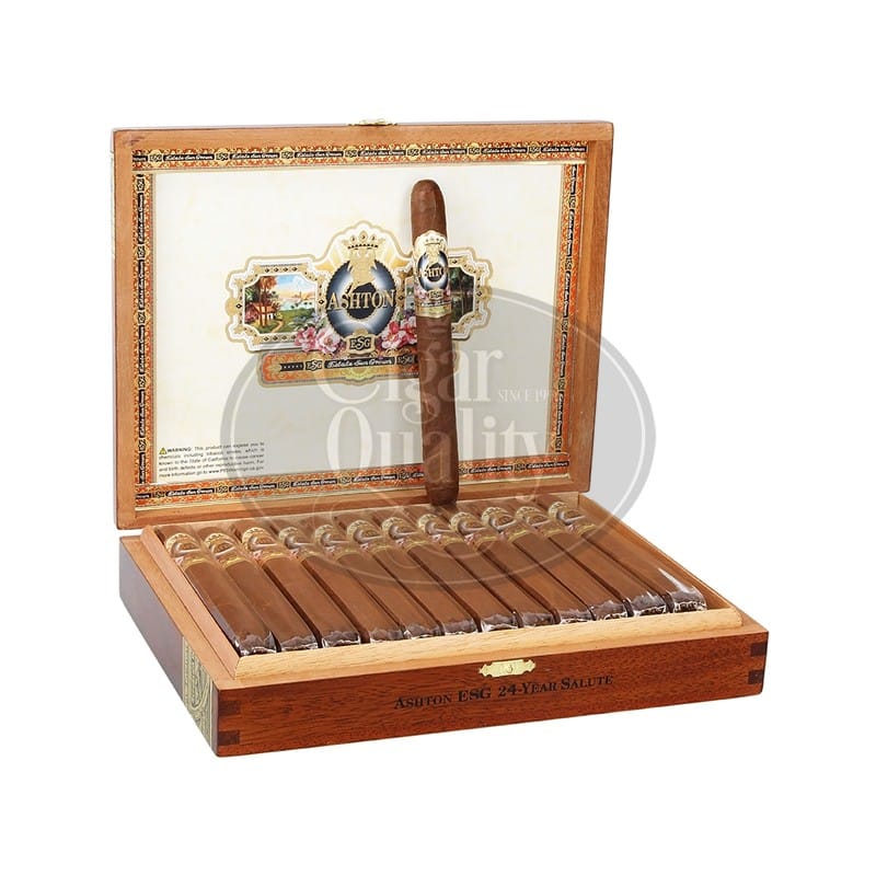 The Ashton ESG 24 Year Perfecto cigar measures 168 mm in length with a diameter of 19.05 mm. Smoking time is approximately 75 minutes. Ashton 24 Perfecto cigars are available in boxes of 25.