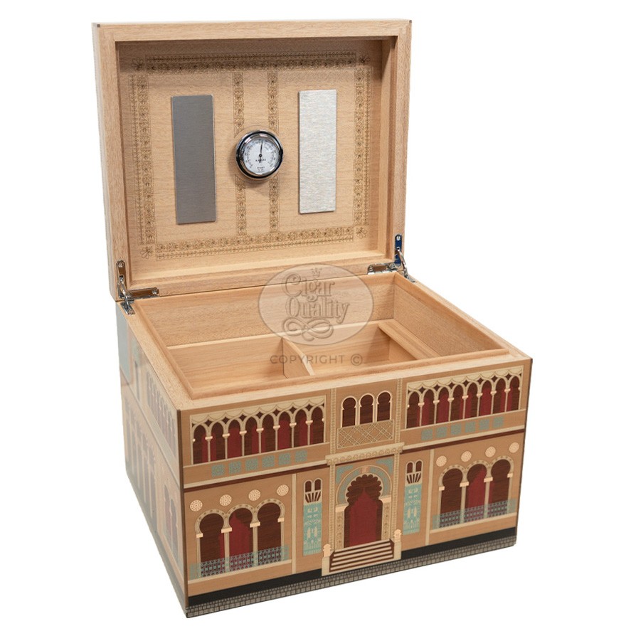 宽 32 厘米、深 27 厘米、高 23.5 厘米的宽大尺寸,可满足您的各种需求。’雪茄保湿盒 Elie Bleu Casa Cubana Palais Cienfuegos 这款雪茄保湿盒将美学、功能和尊贵完美地结合在一起,是雪茄爱好者和收藏家不可或缺的珍品。.