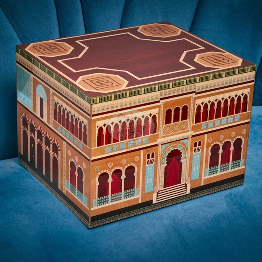 L'雪茄保湿盒 Elie Bleu Casa Cubana Palais Cienfuegos 是标志性系列 古巴之家, célébrant l’alliance entre Cuba et l’Andalousie. Inspiré du Palacio de Valle, chef-d’œuvre arabo-andalou du début du XXᵉ siècle, ce coffret raconte un récit architectural et romantique où chaque façade marquetée incarne un fragment d’histoire, entre héritage andalou et atmosphère cubaine. Édité à seulement 199 exemplaires numérotés, il peut accueillir jusqu’à 110 cigares et se distingue par son raffinement et sa rareté (le numéro de l’exemplaire ne peut être défini à l’avance).